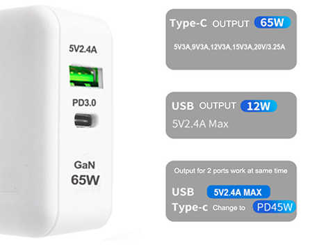 5.Fast charging of both ports.At the same time the output does not decelerate.USB+Type-CHighest when used at the same time45W.Type-C Single port access 65W