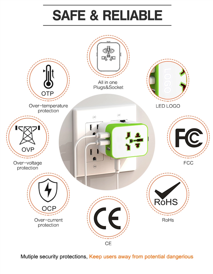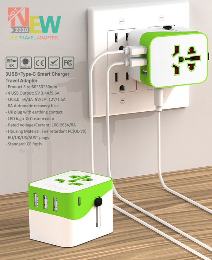 QUAD USB CHARGING PORTS , This Universal Adapter has 3 USB Ports and 1 Type-C Port, the input voltage of the USB is 100-240VAC, which means you can use it around the world to charge multiple USB devices at the same time, such as your cell phone, iPhone, iPad, Power Bank, MP3/4/5 and Camera etc. Protection comes with LED power indicator, plug lock system, over-current (overload), high-temperature, short-circuit and surge protection built-in.